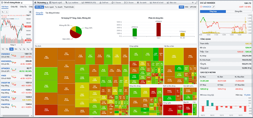 Phiên giao dịch ngày 17/12/2024 ghi nhận VN-Index giảm nhẹ 2.07 điểm, đóng cửa tại 1,261.72 điểm. Ngay từ đầu phiên, chỉ số có sự giằng co quanh vùng 1,260-1,265 điểm, nhưng áp lực bán tăng mạnh vào cuối phiên đã kéo VN-Index xuống dưới mốc tham chiếu. Thanh khoản thị trường sụt giảm đáng kể, với giá trị khớp lệnh chỉ đạt 8,698 tỷ đồng, giảm 5.51% so với phiên trước.