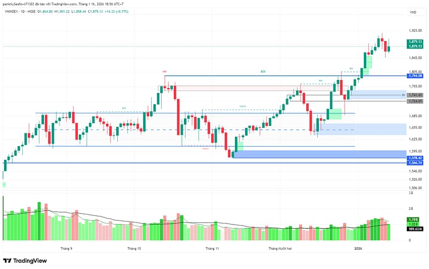 - Ngưỡng hỗ trợ: 1.850 – 1.860 điểm (tương ứng đường MA10 và vùng Gap trước đó).