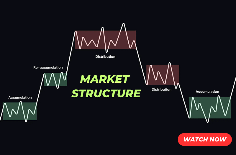 • Cấu trúc thị trường (Market Structure): SMC phân tích các giai đoạn của thị trường như xu hướng tăng, xu hướng giảm, hoặc tích lũy. Các nhà giao dịch sử dụng các công cụ như đỉnh/đáy (Higher Highs/Lower Lows) để xác định xu hướng và điểm đảo chiều.