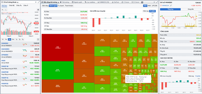 Thị trường chứng khoán Việt Nam ngày 03/12/2024 ghi nhận diễn biến đi ngang khi VN-Index giảm nhẹ 1.38 điểm, đóng cửa tại 1,249.83 điểm. Chỉ số HNX-Index gần như không thay đổi với mức giảm khiêm tốn 0.03 điểm, kết thúc phiên tại 225.29 điểm.