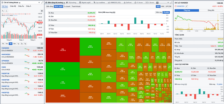 Ngày 11/12/2024, VN-Index tiếp tục điều chỉnh giảm 3.21 điểm, đóng cửa tại 1,268.86 điểm. Chỉ số đã không thể vượt qua ngưỡng kháng cự 1,275 dù đã nhiều lần thử thách. Độ rộng thị trường nghiêng về phía tiêu cực với 244 mã giảm so với 145 mã tăng, phản ánh tâm lý thận trọng của nhà đầu tư. Thanh khoản trên sàn HOSE tăng nhẹ, đạt 15,277 tỷ đồng nhưng vẫn nằm dưới đường trung bình MA20, cho thấy lực cầu chưa đủ mạnh để đẩy giá lên cao.