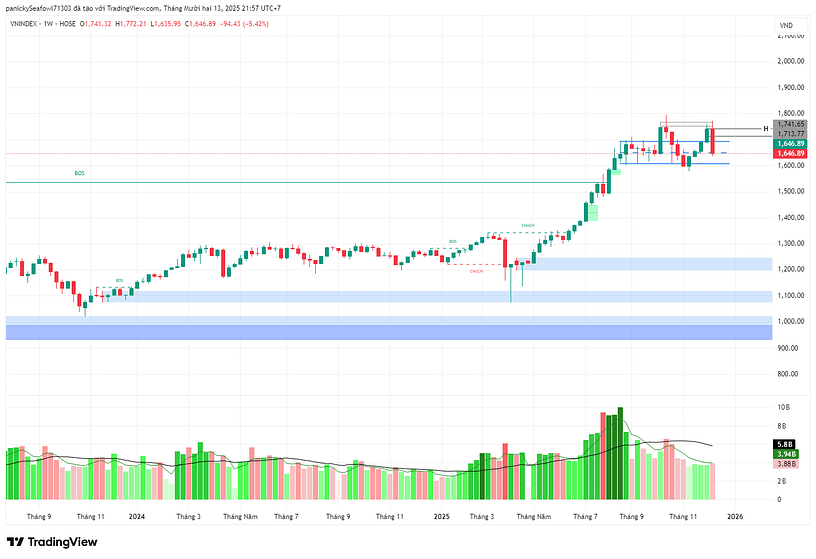 - Khối lượng giao dịch ở vùng đỉnh rất lớn (thanh volume xanh cao chót vót trên khung 1M), cho thấy sự tham gia mạnh mẽ của dòng tiền lớn, nhưng cũng cảnh báo sự phân phối nếu giá không giữ được đà tăng.