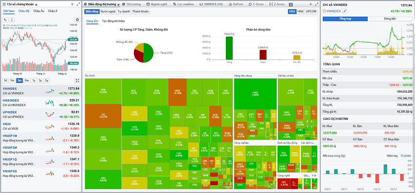 Phiên giao dịch ngày 09/12/2024, VN-Index tiếp tục duy trì trạng thái giằng co quanh ngưỡng tâm lý 1,270. Kết phiên, chỉ số tăng nhẹ 3.70 điểm, đạt 1,273.84 điểm, trong khi HNX-Index tăng 0.28 điểm, đóng cửa tại 229.21 điểm. Độ rộng thị trường nghiêng về phía tích cực với 235 mã tăng giá, 85 mã tham chiếu, và 146 mã giảm giá.