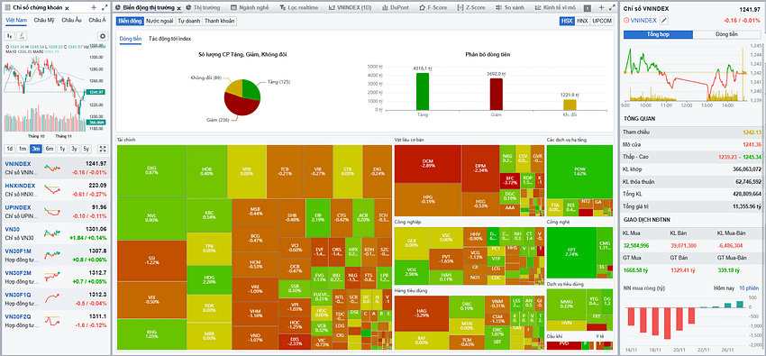 Thị trường chứng khoán Việt Nam ngày 27/11/2024 diễn biến trong trạng thái giằng co với biên độ hẹp. Chỉ số VN-Index dao động quanh ngưỡng 1,240 cả ngày, trước khi chốt phiên tại 1,241.97 điểm, giảm nhẹ 0.16 điểm so với phiên trước. Thanh khoản sụt giảm đáng kể khi giá trị khớp lệnh chỉ đạt 9,230 tỷ đồng, giảm 17.73% so với hôm qua.