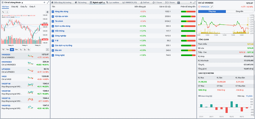 Ngày 10/12/2024, thị trường chứng khoán Việt Nam khép lại với sự phân hóa mạnh mẽ giữa các nhóm ngành và cổ phiếu. VN-Index giảm nhẹ 1.77 điểm (-0.14%), dừng chân tại 1,272.07 điểm, tiếp tục giằng co dưới ngưỡng kháng cự 1,275 điểm. Thanh khoản thị trường đạt 11,504 tỷ đồng, giảm 10.09% so với phiên trước, cho thấy sự thận trọng từ phía nhà đầu tư.