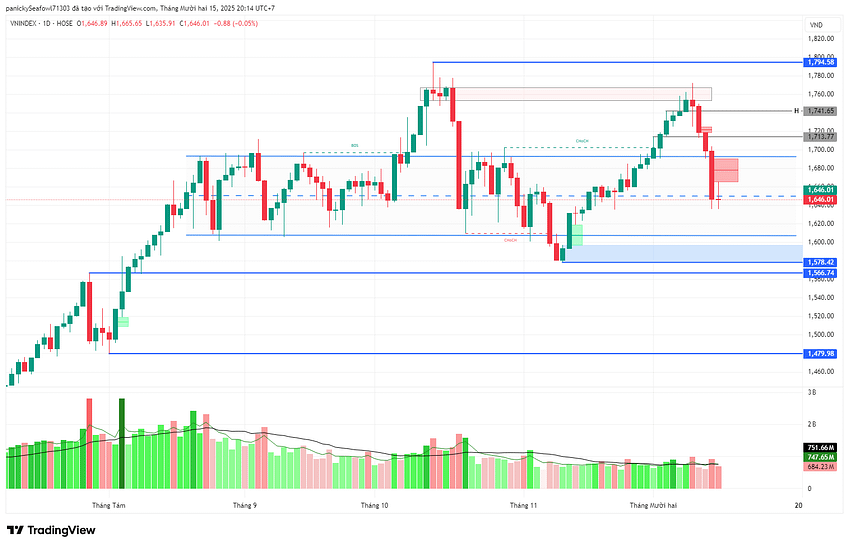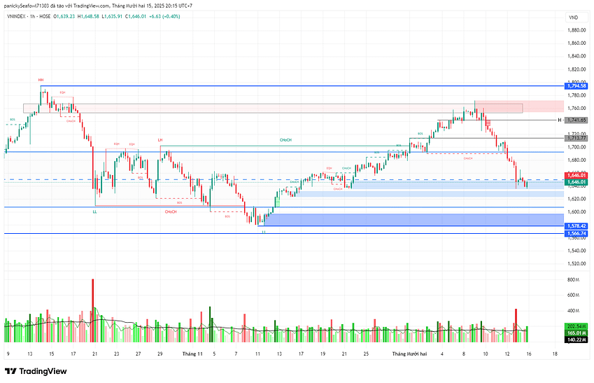 Kết thúc phiên giao dịch ngày 15/12, chỉ số VN-Index đóng cửa giảm nhẹ 0,88 điểm (-0,05%) xuống mức 1.646,01 điểm. Đây là phiên giảm điểm thứ 5 liên tiếp, tuy nhiên, biên độ giảm hẹp và thanh khoản toàn thị trường suy yếu rõ rệt so với cuối tuần trước. Điều này cho thấy áp lực bán đã giảm bớt, và thị trường đang nỗ lực tìm kiếm điểm cân bằng mới.