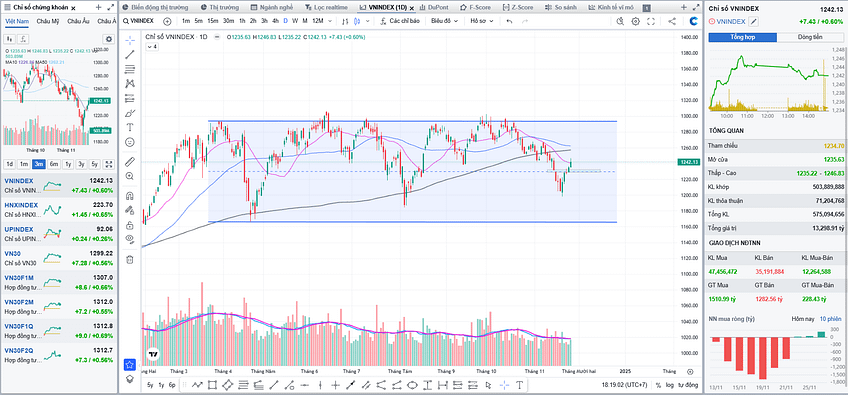 Ngày 26/11/2024, thị trường chứng khoán Việt Nam tiếp tục khởi sắc khi VN-Index tăng thêm 7.43 điểm, chốt phiên ở 1,242.13 điểm. Chỉ số HNX-Index cũng tăng 1.45 điểm, đạt mức 223.7 điểm. Tâm lý nhà đầu tư lạc quan giúp độ rộng thị trường nghiêng về phía tích cực với 290 mã tăng, áp đảo 101 mã giảm.