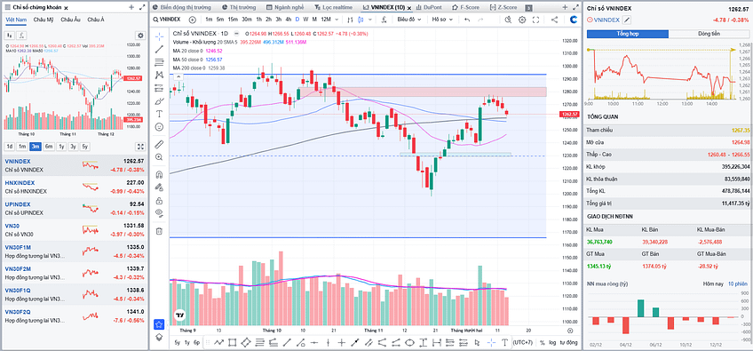 Thị trường chứng khoán Việt Nam ngày 13/12/2024 tiếp tục chứng kiến sắc đỏ, với VN-Index giảm 4.78 điểm (tương đương -0.38%) xuống còn 1,262.57 điểm. VN30 cũng giảm 3.97 điểm, đóng cửa tại mức 1,331.58 điểm. Diễn biến này được xem như sự tiếp nối xu hướng tiêu cực từ các phiên trước, khi thanh khoản yếu và tâm lý thận trọng tiếp tục chi phối thị trường.